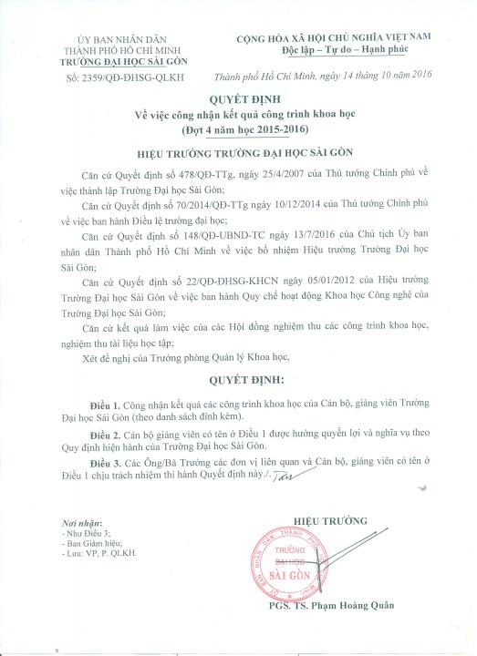 Quyết định về việc công nhận kết quả công trình khoa học đợt 4 năm học 2015-2016
