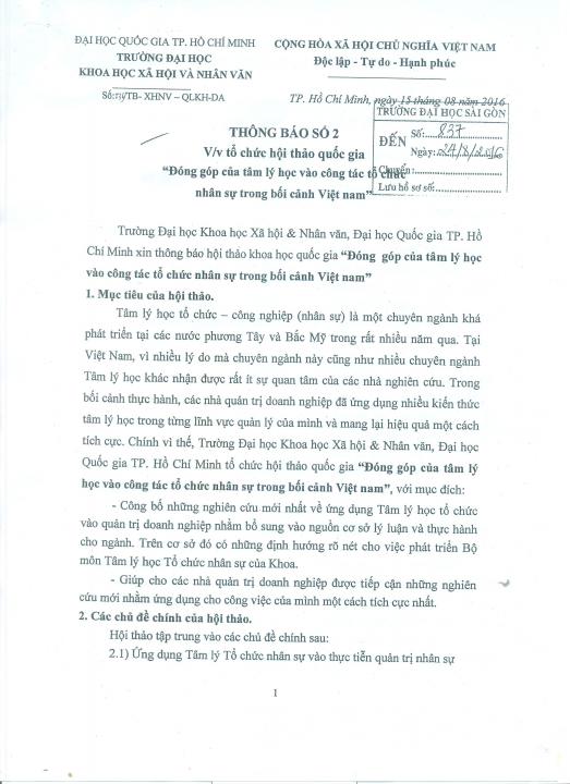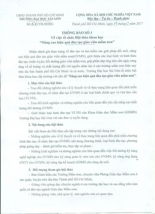 Thông báo số 1 Về việc tổ chức Hội thảo khoa học "Nâng cao chất lượng đào tạo giáo viên các môn KHXH ở TP.HCM"